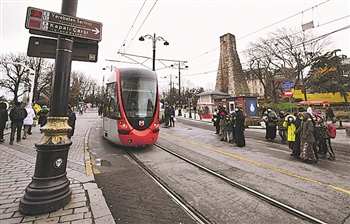 12月18日,游客在土耳其伊斯坦布尔等待一有轨电车驶过。