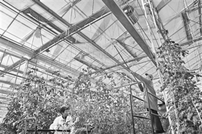 12月19日,江苏省南通市崇川区幸福街道飞悦农业基地,工人正在采摘新鲜蔬菜。这里也是“上海蔬菜外延生产基地”,年供应上海市场蔬菜近6000吨。温室采用互联网+智慧农业技术,能够准确测算光照、湿度以及种植流程,温度、湿度按照不同植物的生长需要及时调整,既节省了劳动力,又提高了生产效益。温室里的长季节栽培小番茄每茬每株可采收30串,产量是普通种植的5倍。通讯员 许丛军 摄