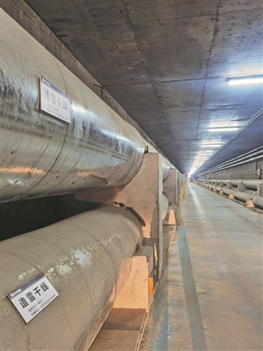 汽车缓缓行驶在水舱里,左侧是两条绿色的造雪干线,右侧是两条生活用水供水线和一条再生水干线。“我之前参建过北京世园会的管廊,那时候没有备用的,这次造雪用水和生活用水都有一主一备,是特别为冬奥设置了双重保障。”胡靖诗说。