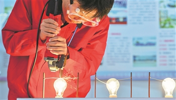 12月22日,长沙汽车工业学校的学生在职业技能展演现场表演“灯泡上割钢丝”。