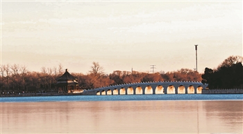 每年冬至前后,阳光恰好照射在北京颐和园十七孔桥所有桥洞的侧壁上,呈现出“金光穿洞”的奇景。12月21日,夕阳的金色余晖穿透十七孔桥,景色壮丽浪漫。一年一度的美景,吸引了不少游客和摄影爱好者前来观赏。