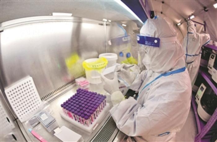 12月23日深夜,西安的街头清冷安静,在西安国际会展中心3号馆内刚刚启用的4套气膜实验室,身着防护服的工作人员正进行忙碌有序的核酸检测。据了解,4套实验室每日最高检测产能可达50万管,若按10混1采样方式,每日最高可完成500万人份的核酸检测任务。