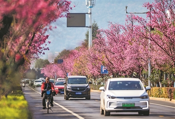 这是12月21日拍摄的云南省昆明市红塔西路绽放的冬樱花。当日,昆明市阳光明媚。在昆明市一些路段,道路旁种植的冬樱花在蓝天下绽放,美景如画。新华社记者 陈欣波 摄
