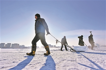12月26日,在黑龙江省牡丹江市江滨码头附近,工人在冰面上运送冰块。近日,牡丹江市气温大幅下降,采冰工人冒着严寒在冰面上进行采冰生产和运输作业。新华社发(张春祥 摄)