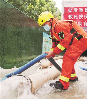 ⑤7月24日,郑州大学第一附属医院河医院区,救援人员进行排水作业。新华社记者 许雅楠 摄