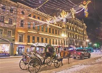 新年即将到来,俄罗斯圣彼得堡街头点亮各色灯饰,营造节日气氛。