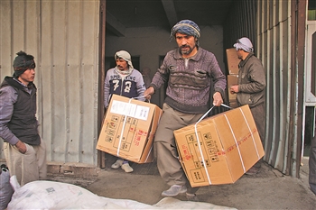 12月24日,在阿富汗喀布尔,一名男子搬运中国援助的物资。阿富汗临时政府难民事务部24日在首都喀布尔举行仪式,将中国捐赠的一批人道主义援助物资分发给阿富汗34个省。