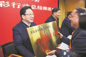 河南省委副书记、政法委书记周霁(左一)为2021年全省乡村振兴劳模出彩行动先进集体和个人颁奖 。