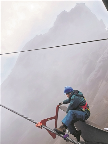 12月12日,黄山顶上零下3摄氏度,玉屏索道的检修工在测量索道进站导轨位置。汪刚 摄