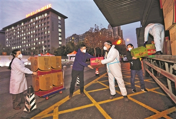 12月30日,货运司机将爱心物资送到西安市中医医院工作人员手中。