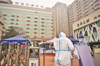 图4:1月5日,一名志愿者在陕西省肿瘤医院门前将患者预订的午餐送至护士手中。