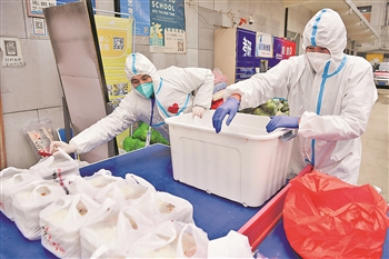 图3:1月4日,两名志愿者在西安市雁塔区德善爱心共享厨房打包食品。