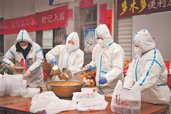 图2:1月4日,志愿者在西安市雁塔区德善爱心共享厨房打包食物。