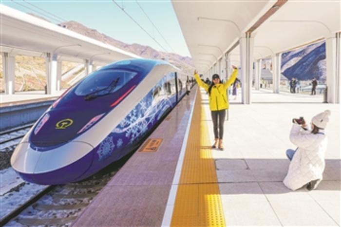 1月6日,乘客在G8811次北京冬奥列车前拍照留影。本报记者 王伟伟 摄