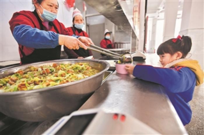 1月4日,在沙洲芙蓉学校,学生在等候食堂阿姨盛饭菜。