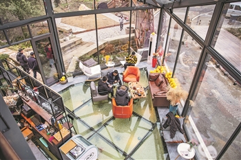 1月5日,在重庆市梁平区竹山镇猎神村,游客在矿山遗址上改建的“矿咖”饮品店内休闲。
