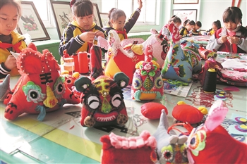 以“缝、剪、蒸、谈、画”为内容的实践课堂上,小学生们缝布老虎、剪纸老虎、捏泥塑老虎、蒸花饽饽老虎,在学习中进一步了解非遗文化,感受中华优秀传统文化魅力。
