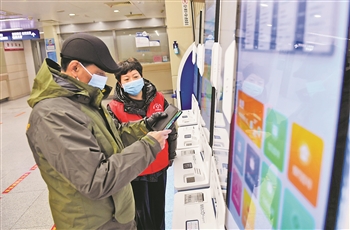 1月8日,在西安交通大学第二附属医院,志愿者协助就诊患者支付挂号费。