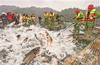 据了解,江西省新余市仙女湖有机鱼具有人放天养、额定捕捞、巨网捕大留小等特点。在保障渔业生态循环发展的同时,该湖全年可产500万斤鱼,供应上海、重庆等全国市场,年产值 5000多万元,带动了周边300多户农民入股分红、增收致富。赵春亮 摄/视觉中国