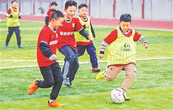1月10日,通顺街小学的小球员们在进行足球分组对抗赛。