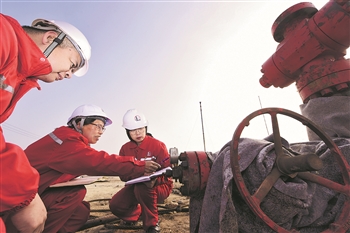 图为1月7日,该厂地质科研人员路香丽(左二)和同事正在进行产量调查。吴木水 王林涛 摄