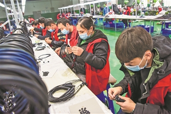 1月11日,在新疆墨玉县产城融合园,和田瓴海电子有限责任公司的员工在流水线上作业。