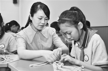 安徽合肥,一位小学语文老师在课后服务中“变身”编织社团的老师,教孩子们编织各种工艺品。新华社记者 周牧 摄