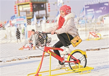 1月10日,来自孟加拉国的留学生伊淑在稻渔空间体验冰上自行车。当日,宁夏医科大学的27名留学生在老师的陪同下,来到银川市贺兰县稻渔空间体验冰上爬犁等项目,感受冰雪氛围,共同迎接北京冬奥会的到来。新华社记者 冯开华 摄