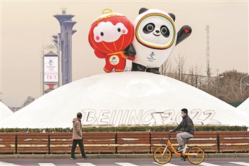1月12日,约7.5米高的北京2022年冬奥会和冬残奥会吉祥物“冰墩墩”“雪容融”在位于北京中轴线的奥林匹克景观大道南端亮相。本报记者 王伟伟 摄