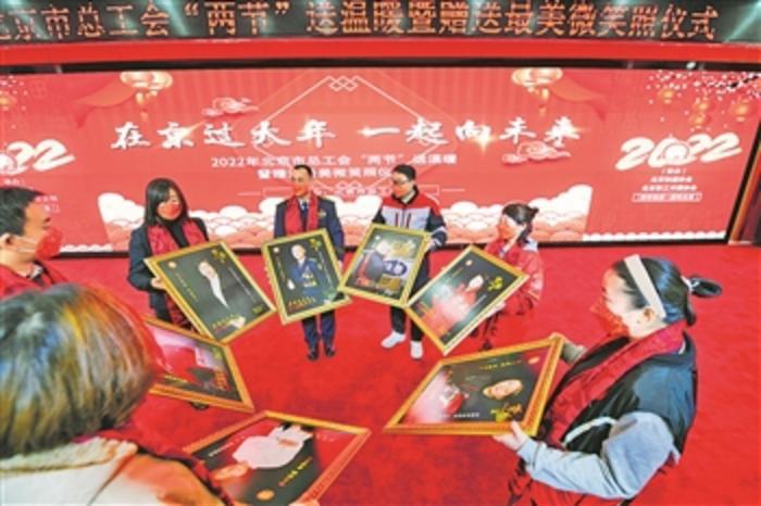 1月13日, 2022年北京市总工会“在京过大年,一起向未来”向一线劳动者赠送最美“微笑照”仪式在北京职工服务中心举行。活动现场,30名 “首都最美劳动者”“首都最美快递小哥”“首都最美送餐小哥”代表收到了北京市总工会为他们送上的新春祝福——装帧精美的“微笑照”和新春“福包”。