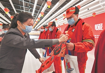 1月14日,在杭州市党群服务中心,工作人员为参加“暖冬同行”活动的环卫工人送上定制版新年礼包和春联、福字。