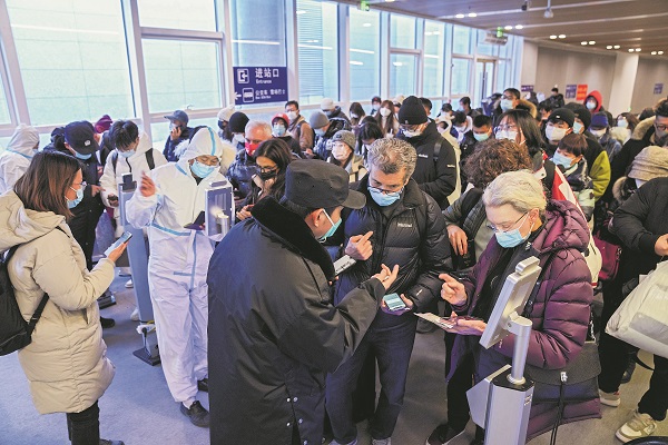 2021年12月24日,河北省张家口市崇礼区太子城站,乘客向工作人员出示核酸检测结果、流调码等信息。为了保证北京2022年冬奥会的顺利举行,崇礼区进一步完善了医疗保障和疫情防控体系。