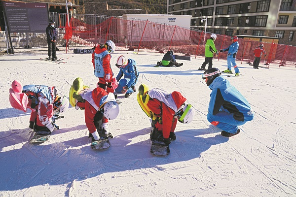 2021年12月22日,河北省张家口市崇礼区云顶滑雪场初级道上,教练员正在帮助孩子们学习单板滑雪。北京2022年冬奥会期间,云顶滑雪公园将承办多项冬奥赛事。