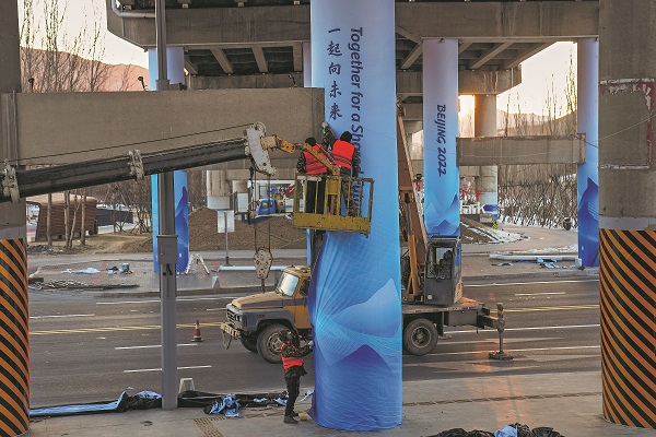 2021年12月22日,河北省张家口市崇礼区,工作人员正在装扮一处高架桥的桥墩。2021年9月17日,北京冬奥会、冬残奥会主题口号正式对外发布——“一起向未来”!