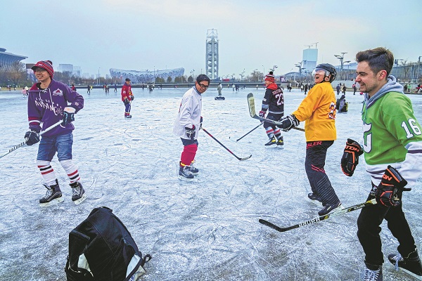 1月9日,北京,冰球爱好者在位于奥林匹克公园的一处冰面上打冰球。
