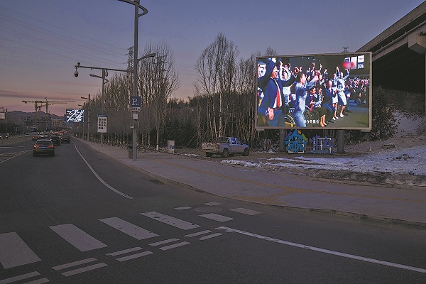 2021年12月22日,河北省张家口市崇礼区,一处电子屏上正播放着2015年北京携手张家口获得2022年冬奥会举办权时的视频画面。随着“带动三亿人参与冰雪运动”目标的提出,冬奥会的申办让更多人因冰雪运动受益。