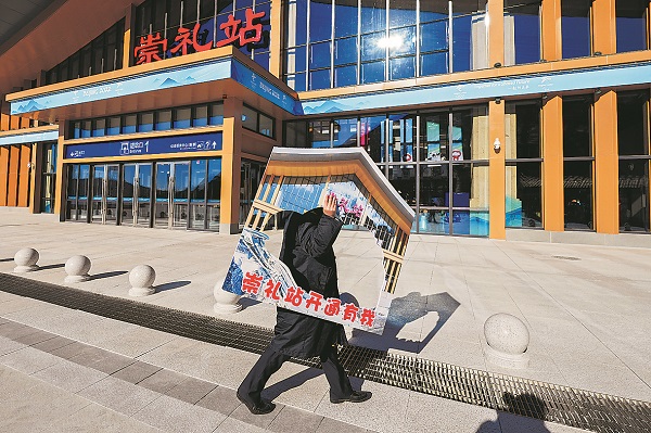1月6日,河北省张家口市崇礼站正式投入运营。高铁站的一名工作人员正在搬运一块印有“崇礼站开通有我”的广告板。