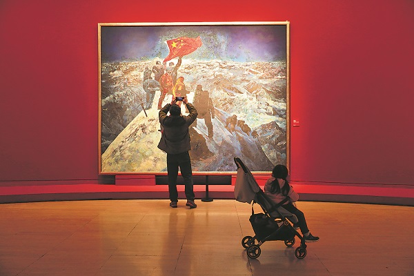 1月11日,北京中国美术馆,观众正在观赏“迎冬奥·美在逐梦”馆藏体育题材美术作品展。此次展览共展出中国画、油画、雕塑、摄影等各类作品160余件。