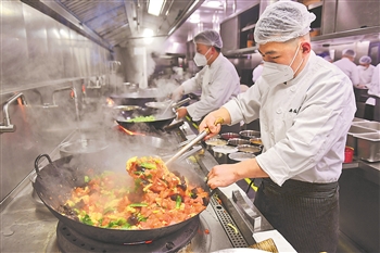 1月13日,在陕西省西安市西安饭庄东大街总店,厨师炒制菜肴。