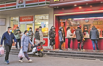 1月17日,人们在西安市碑林区一家食品店排队购买食品。