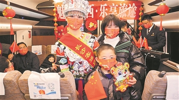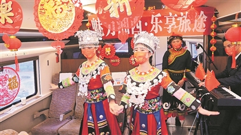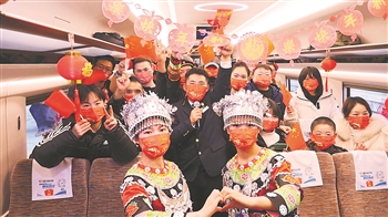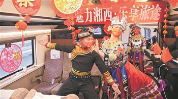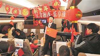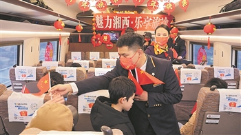 “欢迎大家乘坐广州局集团公司长沙客运段高铁动四车队担当的‘魅力湘西 乐享旅途’复兴号列车……”随着工作人员悦耳动听的声音,“魅力湘西 乐享旅途”春运首日活动拉开序幕。长沙客运段高铁动四车队的动哥动姐身着湘西土家族、苗族服饰,为旅客们带来湘西民族舞蹈《红喜宴》;吉他弹唱思乡歌曲、春运小知识问答、手势舞+合唱《newboy》……精彩纷呈的节目,不时赢得旅客的喝彩声和掌声,车厢内充满了欢笑与温馨,不少旅客参与到合唱与小礼品互动问答中来,大家一起感受高铁给山区人们生活带来的舒适、快捷和温馨喜人的变化。