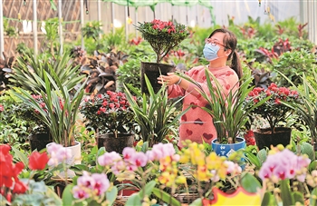 1月18日,游客在河北省新河县西郑家庄村花卉种植基地选购鲜花。