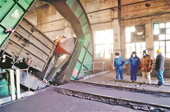 图为技术交接作业场检车员在热电厂翻车库巡检时,向企业工作人员宣传爱车知识。关彬 张斌 摄