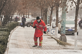 1月20日,大寒,北京朝阳区街头,环卫工人正在雪中清扫。