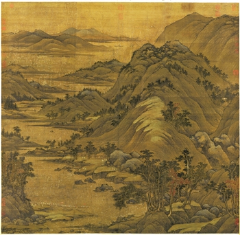 董源(一作“董元”),字叔达,钟陵(今江西进贤)人,生年不详,大约卒于公元962年。曾担任过南唐翰林图画院北苑副使,故又称“董北苑”。擅画江南山水,世传他画法有两种,一是学王维的水墨,另一是源自李思训的青绿设色,所创的“披麻皴”技法对后世的文人画有着极为深远的影响。