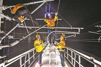 1月23日凌晨,接触网工冒着寒风检修接触网设备。春运期间,中国铁路南宁局集团有限公司南宁供电段的20余名接触网工,对接触网展开全方位检修,确保列车通行安全。这些高空作业的身影,仿佛一个个“空中舞者”。新华社记者 曹祎铭 摄