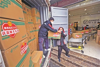 1月21日,大雪纷飞中,西安市顺丰快递桃园分部工作人员将“温暖大礼包”分拣入库,这些装有慰问品和春联福字的礼包将被送到困难职工、劳动模范和抗疫一线职工的手中。