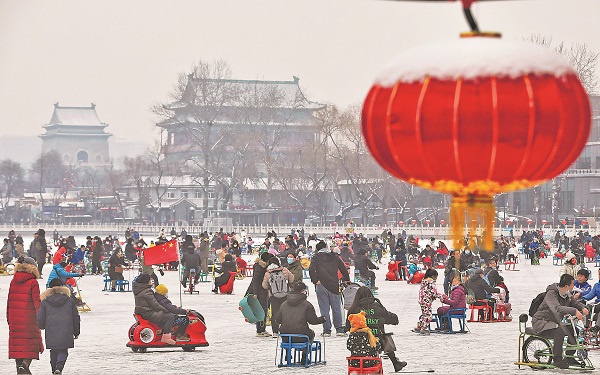 图为1月23日,北京什刹海冰场,市民享受冰雪运动带来的乐趣。