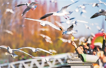 1月23日,游人在昆明市滇池海埂大坝上观赏、投喂红嘴鸥。