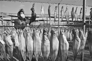 在位于山东沿海的荣成市石岛管理区王连街道北桥头村,村民们晾晒鱼干,准备供应市场。这种鱼干是当地极具特色的美食。新华社记者 徐速绘 摄